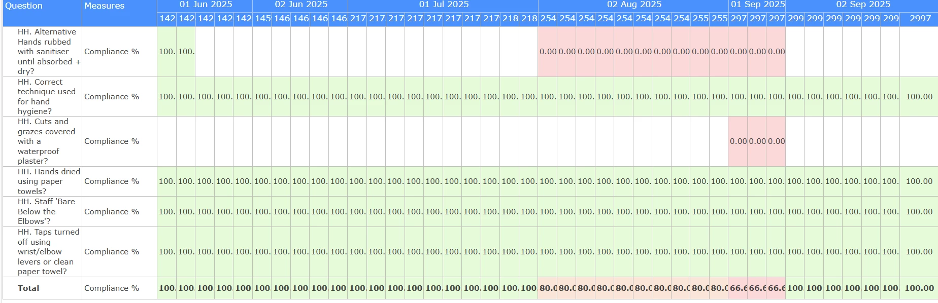 Hi Steff, you cannot see the compliance on individual level in that view - but you can get the heatmap to show you where the non compliance as well as compliance per ID. I have added the ID in the Audit Trend Analysis Page and you can see per audit/checklist. I have it set up to show last 3 months.