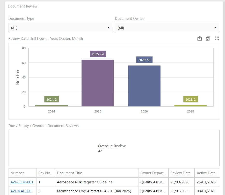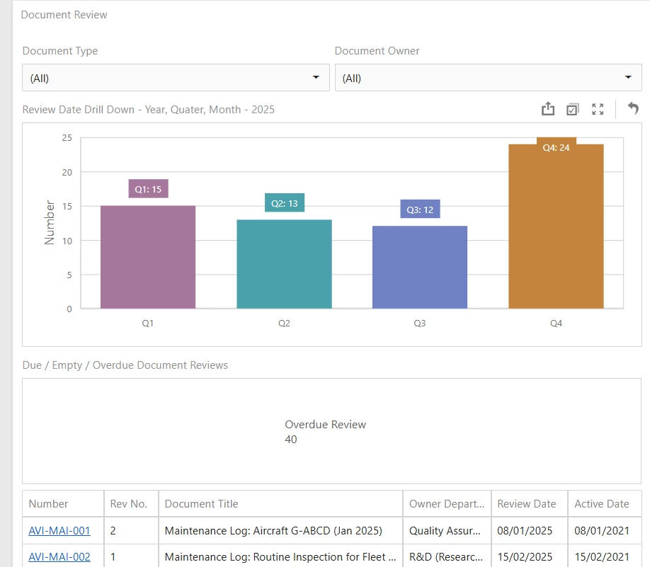 Documents overdue review, based on the ‘Target Date’ in the Document’s main ‘Summary’ box, not the actual reviews which are recorded under the ‘Reviews’ tab. (Most of our documents are yet to have any reviews as they are newly-uploaded.)