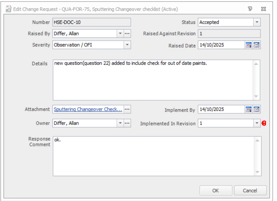 - Activate the document and during activation you will be asked by the wizard to identify what changes have been implemented.