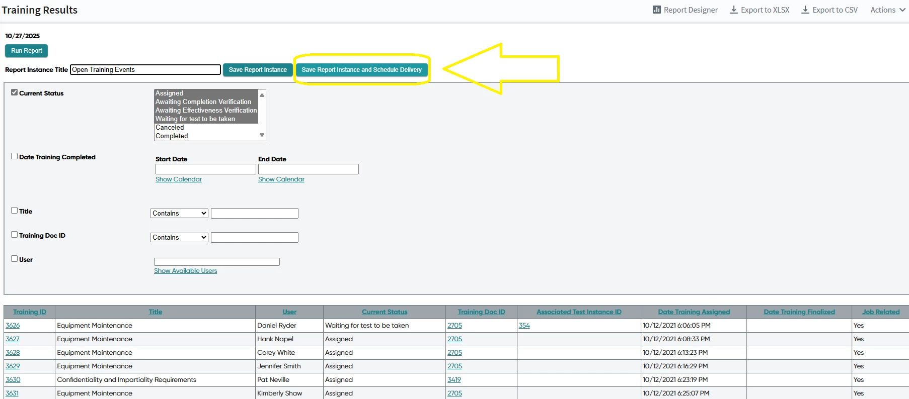 We want to send a report summarising the staff who has not completed their assigned training in time, or tests assigned more than 15 days ago. This report would be sent as an email to their managers on a weekly basis.